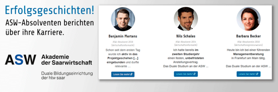 An der ASW gGmbH werden seit 1991 attraktive duale Studiengänge (seit 2007 mit staatl. anerkanntem akkreditiertem und hochschulrechtlich gleichgestelltem Bachelor-Abschluss) angeboten. Ein duales Studium bedeutet damit sowohl eine wissenschaftlich fundierte als auch praxisnahe Ausbildung.