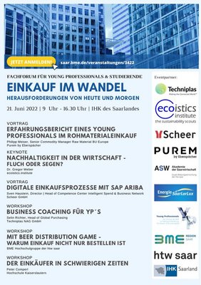 Nach 2 Jahren pandemiebedingter Zwangspause findet zum vierten Mal in den Räumlichkeiten der IHK Saarland, das Fachforum für Studierende* und Young Professionals mit Schwerpunkt Einkauf, Supply Chain Management und Logistik in Kooperation mit dem BME e.V. und der IHK Saarland statt.